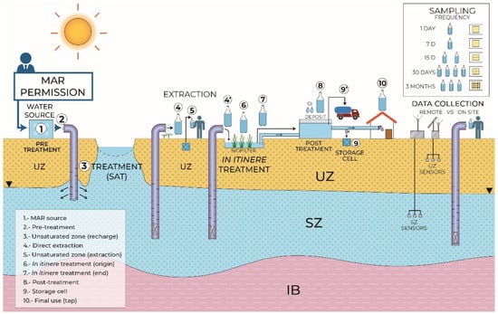 The MIR conceptual model addresses aspects related to monitoring, such as the cost of the hydrochemical analyses, the location of sampling (horizontally and vertically), and the data collection frequency and system (Figure 5). Since water quality is a vital aspect of ensuring the safety of human health and ecosystems, water sampling during MAR operations should be conducted at critical points. These points must be specified in the monitoring guidelines. The MIR conceptual model differentiates 10 sampling points along a MAR system (Figure 5): (1) water origin, (2) pre-treatment, (3) the unsaturated zone during recharge, (4) direct groundwater extraction, (5) the unsaturated zone during groundwater extraction, (6) treatment of water along the MAR system (the Latin term “in itinere”, which means “on the road” or “on tour”, was selected and comprises MAR system elements such as biofilters or vegetated channels), (7) endpoint of the in itinere segment when there is subsequent treatment, (8) post-treatment sampling spot, (9) storage node for recovered MAR water, and (10) final use (e.g., tap water). From these points, the most frequently sampled among MAR projects are either the direct abstraction (Figure 5, point 4) or the end point of in itinere treatment (Figure 5, point 7).