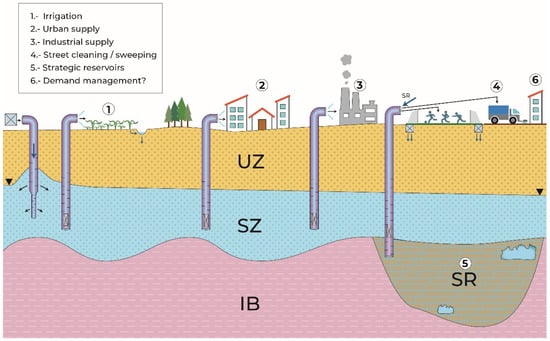 There are multiple final uses of the recharged water. The most common ones are irrigation, industrial supply, urban water supply, street sweeping and cleaning, reuse, storage in strategic reservoirs (SRs) for long-term availability (e.g., water storage for emergencies and future generations) [], groundwater storage augmentation, (positive) hydraulic barriers, and short-term temporary storage (Figure 6). Other uses observed in MAR systems worldwide include water transfers and environmental restoration of high-ecological value assets, such as wetlands and springs. Mining is often included in the group of industrial uses.