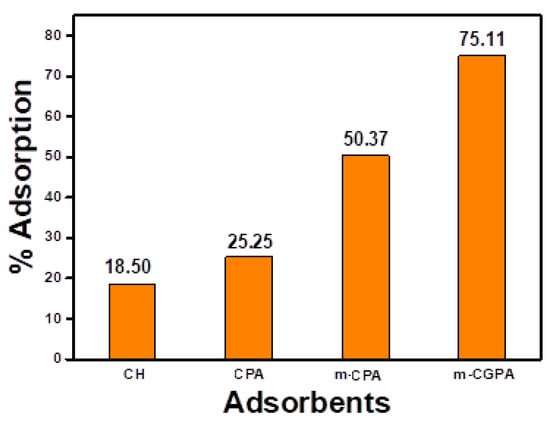 In order to compare the adsorption efficiencies of various unmodified and partially modified chitosan with m-CGPA, four materials were selected. These were, chitosan powder (CH), glutaraldehyde crosslinked chitosan-polyvinyl alcohol beads (CPA)), magnetic glutaraldehyde crosslinked chitosan/polyvinyl alcohol beads (m-CPA), and magnetic glutaraldehyde crosslinked chitosan/graphite/polyvinyl alcohol hydrogel microspheres (m-CGPA) were initially tested for adsorption. For this, 0.1 g of specific adsorbent was added to 25 mL of 50 mg L−1 RO 16 dye solutions taken in different 50 mL stoppered conical flasks, and then the solutions were kept on the shaker for a time period of 30 min. After 30 min of contact time, the supernatant liquid was decanted with the help of a circular magnet kept below a conical flask, and the amount of dye adsorbed was calculated. These screening experiments established that m-CGPA hydrogel microspheres have shown the maximum amount of dye adsorption. Figure 2 collates the % adsorption removal and different type of adsorbents used. It was observed that the native chitosan has a very low adsorption tendency toward RO 16. With the incorporation of PVA, Fe3O4, and graphite in the chitosan matrix, the adsorption capacity has been enhanced by about four times within just 30 min. Also, among the native chitosan as well as successive modifications, the final modification was most efficient for the removal of RO 16 dye.