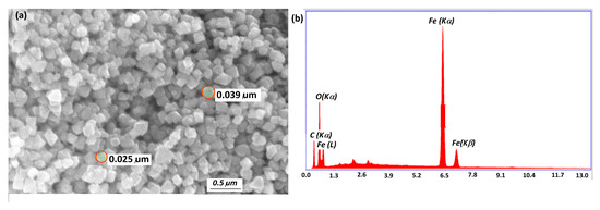 Adsorbents are characterized by SEM-EDS to determine their surface morphology and elemental composition. The surface of m-CGPA shows sphere-like structures and a rough surface thereby leading to greater surface area and enhanced adsorption. EDS image shows the presence of C, O, and Fe peaks. Figure 4 displays the SEM image and EDS analysis of m-CGPA. EDS signals that iron has been incorporated into the matrix of the adsorbent based on the presence of Fe peak in the spectrum. Similar results have been reported by Korde et al. [41].