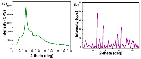 Figure 5 displays characteristic peaks present in chitosan and m-CGPA. In order to determine the crystalline phase of an adsorbent, XRD analysis is necessary. The XRD spectrum of chitosan (Figure 5a) showed characteristic peaks of chitosan at 2θ = 10.74° and 20.02°. In the case of m-CGPA (Figure 5b), the peaks at 2θ = 26.83°, 36.05°, 43.77°, 57.53°, and 63.04° correspond to diffraction peaks of Fe3O4 and planes (220), (311), (400), (511), and (440). The peak at 2θ = 10.00° corresponds to the shifted peak of chitosan. Possibly, this shift in peak is caused by crosslinking of starting materials resulting in reduced crystallinity of microspheres. In microspheres, Fe3O4 peaks indicate that the crystal structure was unaltered [32,34,41].