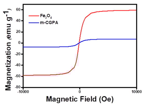 Magnetic hysteresis loop of m-CGPA in comparison with Fe3O4.