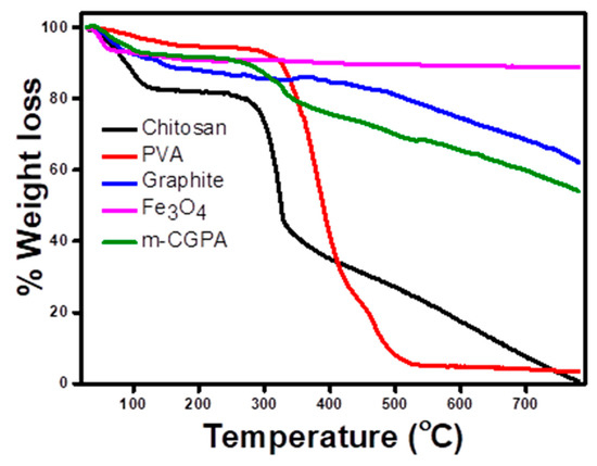 Thermogravimetric analysis helps in determining the stability of adsorbents at higher temperatures. A TGA curve for the starting material and a TGA curve for the final material is shown in Figure 7. Pure chitosan was found to show rapid degradation in the temperature range of 250–320 °C while pure PVA degraded rapidly between 250 to 500 °C. When highly stable oxide of iron Fe3O4 was introduced into the matrix along with graphite, the m-CGPA so formed showed properties intermediate between the organic polymers and the inorganic components. The thermal degradation of these polymers was found to reduce from 100% to 36.26% up to 800 °C in m-CGPA [42].
