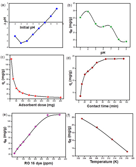 (a) pH PZC for m-CGPA, (b) influence of RO 16 dye pH (c) influence of m-CGPA dose (d) influence of contact time on RO 16 dye adsorption (e) influence of initial concentration of RO 16 dye (f) influence of temperature on RO 16 dye adsorption.