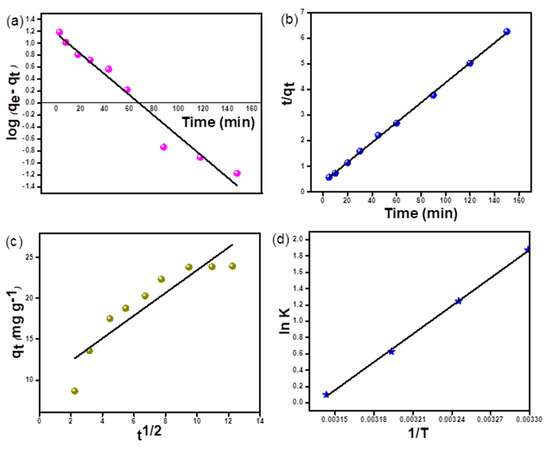 The interdependence of removal efficiency and period of adsorption was checked out by varying contact time from 5 to 150 min. With an increase in contact time to 90 min, the adsorption efficiency increased considerably, thereafter it tended to be stable aiming toward equilibrium attainment of the adsorption process. Hence, this time period was selected for further studies (Figure 8d). This is in agreement with earlier studies, the rapid adsorption at the beginning was in reference to abundant vacant sites for adsorption. However, with the passage of time, dye molecules gradually filled adsorption sites, inhibiting further adsorption and slowing the total adsorption process till equilibrium was reached [22,45]. Figure 9 collates kinetic plots of pseudo-first order, pseudo-second order, and intraparticle diffusion model (IPD). The fitting parameters are listed in Table 1. From the table, it is clear that the experimental data are in complete agreement with the pseudo-second-order kinetics model equation. The expression for this pseudo-second-order model is as given below: