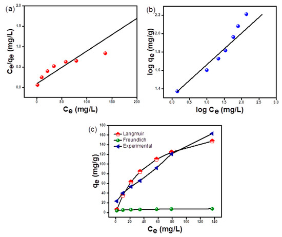The adsorption isotherm studies help in establishing the mechanism of interaction between adsorbent and adsorbate. The interrelationship between adsorption capacity and varying dye concentration details information for the knowledge of probable adsorption mechanisms. The adsorption capacities were calculated by fitting experimental data into the equation by various models. Langmuir and Freundlich’s models were used for fitting experimental data (Supplementary Table S1). The various adsorption isotherm parameters are presented in Table 2. Figure 10c collates that the Langmuir isotherm model fits best for experimental data. Also, the magnitude of the regression coefficient from Table 2 lies unerringly near 1.0 for the homogenous Langmuir isotherm model. The Langmuir isotherm is predicated on the idea that each valence point on the adsorbent’s surface has the capacity to adsorb one molecule [49]. The separation factor, one of the essential parameters obtained from Langmuir isotherm being in the range from 0.13–0.375 for 25–300 mg L−1 initial concentrations of RO 16 dye shows monolayer homogenous adsorption of dye molecules emphasizing the fact that RO 16 dye adsorption process by hydrogel microspheres is favorable and advantageous [50]. The value of suggests a chemisorption type of adsorption process and the value being less than unity specifies an excellent process of adsorption [33,51]. The maximum adsorption capacity for hydrogel microspheres obtained from the best-fitted Langmuir adsorption isotherm model shows a benchmark when compared with other similar chitosan-based adsorbents. This has been represented with the help of Table 2. Hence, it can be considered advantageous because of its easy separation and promising hydrogel microspheres adsorbent for RO 16 dye decontamination from effluents.