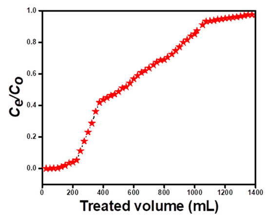 Adsorption studies using a fixed bed column were carried out in order to properly evaluate the adsorption process while handling larger volumes of sample. For this, 100 mg L−1 RO 16 dye solution of pH 4.0 was allowed to pass through a glass column of 10 cm long having 0.5 g of hydrogel microspheres with a flow rate of 10 mL min−1. For the purpose of quantifying the dye, each 25 mL eluent portion was examined for outlet dye concentration. The breakthrough curve was plotted and column parameters such as breakthrough capacity, exhaustion capacity, and degree of exhaustion volume were evaluated with the help of the following Equations (6)–(8). The column parameters have been presented in Table 5. Results show that these hydrogel microspheres are promising for use as an adsorbent in removing RO 16 dye in large sample volumes. Figure 11 shows the experimental graph of column adsorption studies.
