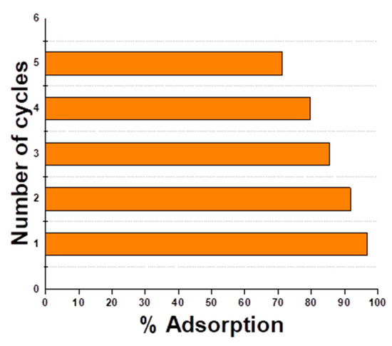 For the practical application of an adsorbent in the industry, it is essential to evaluate economic feasibility and conservation of resources. The regeneration of hydrogel microspheres was tested by using different solutions of 5% NaOH, NaCl, Na2CO3, and Na2SO4. The best results of adsorption were obtained using a 5% solution of NaOH. Even after four cycles of regeneration, % adsorption was more than 70%. This is responsible for the low cost of dye removal. These results (Figure 12) pointed out that hydrogel microspheres are recyclable and stable adsorbent for the removal of RO 16 dye. The desorption of dye molecules from the adsorbent surface can be attributed to the fact that the adsorbent surface acquires a negative charge above pH 7. Hence, under strongly basic conditions, there is a large negative charge on m-CGPA and so there is electrostatic repulsion between the anionic dye and the adsorbent.