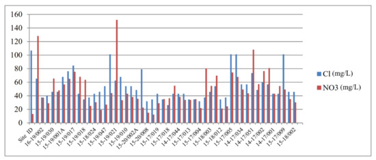 The presence of a certain concentration of nitrogen in groundwater is an indicator of the pollution of this water. Nitrogen leaks into the groundwater from various sources, such as cesspits, urban sewage collection lines, dry and wet sedimentation, the flow of treated and raw wastewater into valleys and waterbodies, fertilizers (chemical and manure), and irrigation with polluted water [45]. According to the study of Qana valley springs in Salfit governorate, Palestine biological tests indicated that all the springs are not suitable for drinking purposes because of their contamination with E. coli and fecal bacteria, and the reason for this contamination is untreated wastewater [64]. Previous studies in the West Bank have shown that 10% of the samples had a hardness value above the permissible limit of the PSI, 15% had a sodium content exceeding the permissible limit of the PSI, and only a very small fraction of the samples (3%) were contaminated with fecal coliforms [43]. Mahmoud pointed out in his study that the concentration of ions and treatments (such as Cl−, Na+, NH4+, TDS, and NO3) affect the quality of water related to aesthetics and health, and those of heavy metals (such as Cr, Cu, Fe, Mn, Pb, Cd, and As), are within the recommended limits for drinking water (Table 3). However, signs of contamination, namely elevated levels of nitrate and ammonium, have been observed even in some deep wells [27]. About 41% of the selected wells in the Tulkarm and Qalqiliya were demonstrated to have nitrate concentrations higher than the limits in the WHO and Palestinian standards, while the chloride concentration was within the acceptable limit [4] (Figure 1).