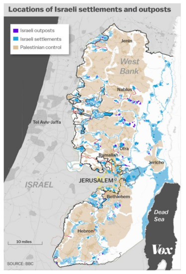 - Williams, J.; Zarracina, J. The Growth of Israeli Settlements, Explained in 5 Charts. VOX. 2016. Available online: https://www.vox.com/world/2016/12/30/14088842/israeli-settlements-explained-in-5-charts (accessed on 13 September 2022).
