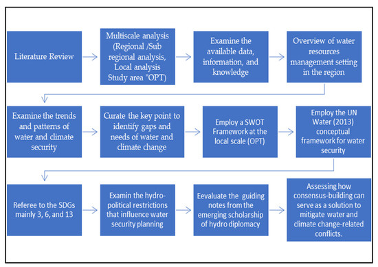 Examining the available data, information, and knowledge, we cast an overview of how water resources management settings in states and regions with complex geopolitical relations operate and how such multifaced complexities, directly and indirectly, impact sustainable water management paradigms since more and more often water is discussed as a subject of conflict in incompatible territorial setting between these parties. To examine the trends and patterns of water and climate security in the region, we curated the key points across different published literature and reports to gain an understanding of gaps and needs. For the local scale analysis, we employed a SWOT (strengths, weaknesses, opportunities, and threats) framework to present the summary of factors that support or undermine the agenda for achieving water security and gather awareness of all aspects involved in decision-making towards planning and policy. In addition, the [15] framework and reference to the SDGs (3, 6, and 13) helped to examine multiple dimensions, including but not limited to the hydro-political restrictions that influence water security planning and climate change adaptation measures. The guiding notes from the emerging scholarship of hydro diplomacy, assessing how consensus building can serve as a potential solution to mitigate water and climate change-related conflicts, were consulted to enrich the discussion and conclusions. The methodological flow chart in Figure 2 illustrates the adopted approach.