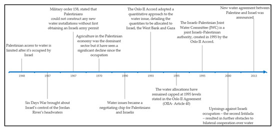 In the sub-region, Israel has had dominant control of water allocation of the Jordan River and two major regional water sources [43], since 1948 [50] and water infrastructure control after 1967, 6-day war [24,57]. Freij’s [20] synthesis reflects on how Palestinians have had limited water access rights to Jordan River water since 1967, which triggered water insecurity in the sub-region (OPT). Moreover, in 1993, the Oslo Accords were signed, treated water as a quantitative issue, assigning various quantities of water to Israel, the West Bank, and Gaza; however, it did not fully address natural factors and socioeconomic developments challenges, thereby creating asymmetric access to precious water resources [46]. It is widely criticized that the accords discourse ignored environmental and social considerations, leaving water disparities [42], economic injustice, inadequate infrastructure, inept water resource management, and disparities stemming from changing trends in water consumption and water access (water rights) between Israel and Palestine [59]. Figure 5 highlights some key events in the water governance history of this region to provide an overview of the past seven decades of dynamics in the shared water resource system.