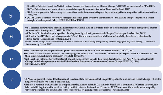 - Integration of plans and policies to manage water crisis and climate change impacts at national and regional levels. In this region, states and communities are severely impacted by multifaceted climate change and will unavoidably have to adapt [20]. Adaptation challenges in the OPT involve a spectrum of reactions and particularly managing the diverse impacts of extreme weather events through a multi-stakeholder partnership between governmental, civil society, and commercial sector players [82]. Climate change adaptation often focuses on the national level, on aspects such as internal relocation, and internal displacement as adaptation strategies. However, these options are also limited by political volatility such as the Israeli–Palestinian conflict and the lack of consensus in managing transboundary water, [61]. International agencies like UNDP focus on efforts (projects and interventions) to build a climate change adaptation strategy and action plan with the input and participation of stakeholders [56]. While it is widely acknowledged that integrated agendas to manage water crisis and climate change impacts have the potential to open up new avenues for cross-border (Israeli-Palestinian) collaboration, much is left to explore the full opportunities for collaboration and consent.
