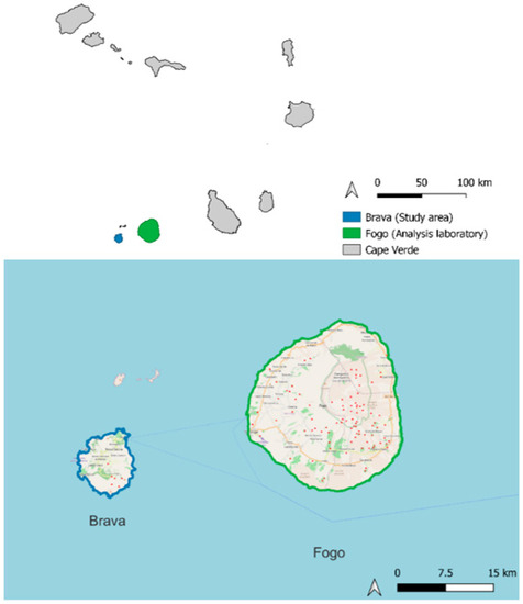 The research area is located in the Republic of Cape Verde, an archipelago in the Atlantic Ocean, west of Senegal, composed of ten volcanic islands (Figure 1). It is characterized by an arid to semi-arid climate, with an average temperature of 26 °C, and a scarcity of water resources on the surface, due to an average annual rainfall of 154 mm and adverse geology. On one of the islands, Brava, groundwater is a resource for the population. Here, samples from two springs—Encontro and Ferreiros—were collected and sent for analysis to another island, Fogo.