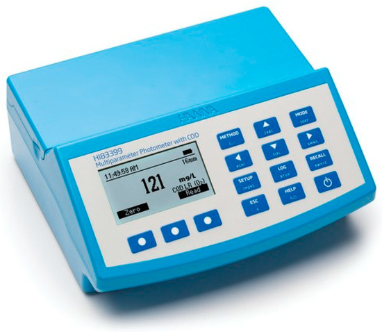 Laboratory tests to determine hardness and the fluoride concentration in the samples collected on the island of Brava were completed using spectrophotometry. The multiparameter photometer used was the HANNA brand model HI83399 (Figure 2).