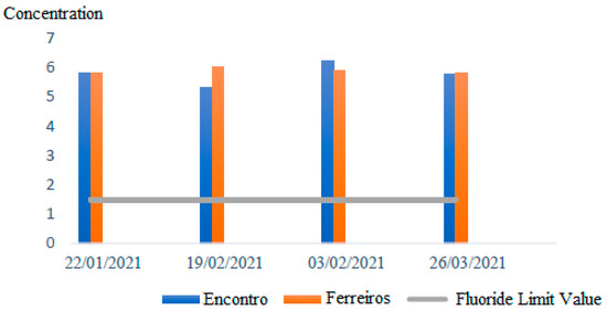 Regarding the analyses performed to determine fluoride concentration, represented in Figure 3, it can be observed that, for both Ferreiros and Encontro, the average values of the sample for each date are well above the established national limit for fluoride, which is 1.5 mg/L.