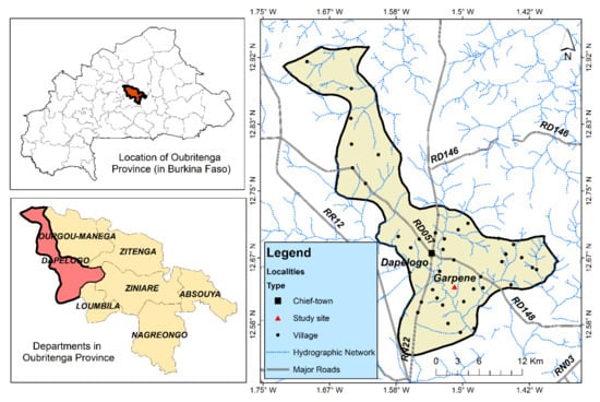 The village of Garpéné is located in the rural municipality of Dapélogo, which is in the Province of Oubritenga in the Plateau Central Region of Burkina Faso (Figure 1). Garpéné village lies with a latitude of 12°38′31″ N and a longitude of 1°30′56″ W.