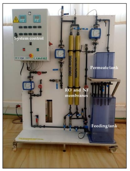Both feed solutions and permeate recovery tanks were made of transparent PVC with capacities of 60 and 18 L, respectively. The feed tank can be filled via a 25 mm filter and an activated carbon filter (5 mm) as well as directly from the feed tank.