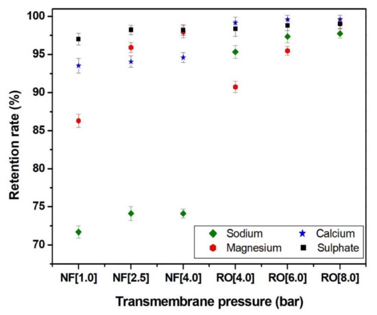 The TW30 reverse osmosis membrane had relatively higher rejection rates than nanofiltration. It, thus, generally presented a higher rejection rate than the NF270 membrane for both divalent and monovalent ions. Indeed, for an applied pressure of 8 bars, the rejection rates of the ions were between 72.9% and 100.0%. In addition, no linear correlation with the ion charge seemed to be evidenced contrary to nanofiltration. Thus, for the reverse osmosis membrane, the passage through the membrane was linked to the solubilisation and diffusion of the compound and therefore depended on the filtration conditions, the characteristics of the membrane and the solution to be filtered. This confirmed the difference in retention mechanism between the porous nanofiltration membrane and the dense reverse osmosis membrane. However, the rejection rates obtained with the NF270 membrane are still high enough to ensure that all permeates obtained after nanofiltration complies with current drinking water standards [26].