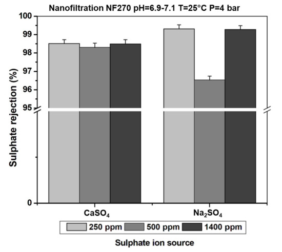 Effect of the sulphate ion concentration in feeding solutions on the rejection rate with the nanofiltration NF270 membrane.