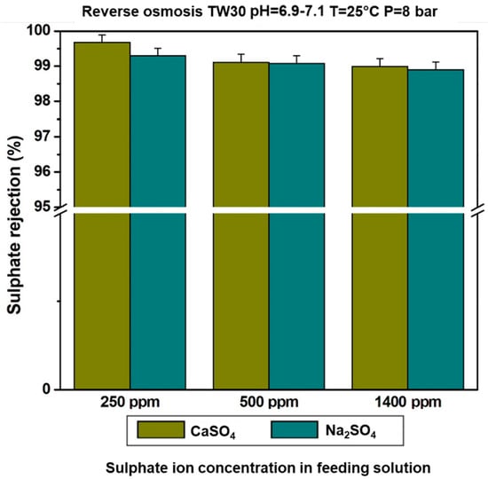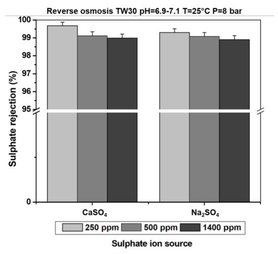 The retention of sulphate was studied considering the type of the counter ion in the solution (notably the valence). Solutions prepared from calcium and sodium sulphate were filtered at constant pressures of 4 bar in nanofiltration and 8 bar in reverse osmosis. Figure 6 and Figure 7 show the comparative rejection rates for each solution and the selected membranes. The results varied in the rejection of sulphate ions, depending on the counter ion. Sulphate ions seem to be better eliminated in the presence of sodium ions for the nanofiltration membrane [32,39,43]. For the reverse osmosis membrane, apart from the concentration of 250 mg/L where the retention of sulphate ions was greater in the presence of calcium ions, there was no significant difference between the other two concentrations [13,17]. The results obtained can be explained by the behaviours of sodium and calcium ions towards the membrane and by the charge balance in the permeate. It was indeed shown that the nanofiltration membrane retained fewer sodium ions. As these were found in large quantities in the permeate, the interactions would lead to a greater rejection of sulphate ions for a charge balance in the permeate. In relation to reverse osmosis, the membrane seemed to behave like a molecular sieve. The separation mechanisms of the membranes, therefore, influenced the behaviours of the ions in the solution to be filtered and condition the compositions of the treatment products.