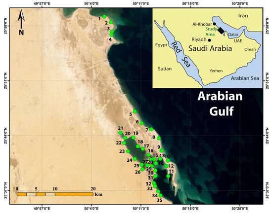 Al-Uqair beach is part of the Arabian Gulf coast, eastern Saudi Arabia. It lies 55 km south of Al-Khobar between 50°00′–50°25′ E and 25°58′–25°23′ N (Figure 1). The coastal area mainly consists of Pleistocene and recent unconsolidated deposits of sand and gravel sheets that, in turn, rest on Miocene and Pliocene rocks of sandy limestone, calcareous sandstone, clay interbeds, and sandstone. Three sediment-based types of shores along Al-Uqair can be distinguished: sand-dominated shores of fine- to very-coarse-grained sand mixed with minor amounts of broken and intact shells, gravel- and mud-dominated shores, and skeletal-dominated shores of macro- and microseashells [30]. The seashells were drifted by tidal currents, and are often mixed with sand and pebbles. Private protected areas were encountered during sampling along the studied coastline, especially the area between samples 5 and 6. We obtained 35 samples from Al-Uqair surface seawater (Figure 1). The exact locations of sampling sites are provided in Supplementary Table S1.