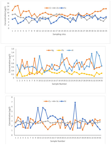 Distribution of Cr, Zn, Fe, Hg, Pb, Al; Cu, Se, and Ni in seawater samples.