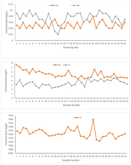 Distribution of Cd, Sb, As, V, and Sr in seawater samples.
