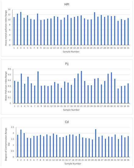 The spatial distribution of HPI (Figure 4) mostly accepts the spatial distribution of HMs (Figure 2 and Figure 3). HPI levels spatially varied from 9.55 in the south to 13.04 as we moved north along the shores of the study area, with an average value of 11.01 (Supplementary Table S1). Five water samples (14.29%) were under medium pollution (HPI = 5–10), and the remaining 30 samples (85.71%) fell under high pollution (HPI > 10). The degrees of contamination (Cd) also varied spatially from 1.46 in the south to 2.33 in the northernmost part of the study area, with an average of 1.78. All seawater samples were categorized under low contamination (Cd < 4). The levels of the pollution index (PIj) varied from 2.01 to 4.22. PIj is a water quality parameter, and, on the basis of its measured values, all the analyzed seawater samples were within the range of good quality (1 ≤ PIj ≤ 5) [34].