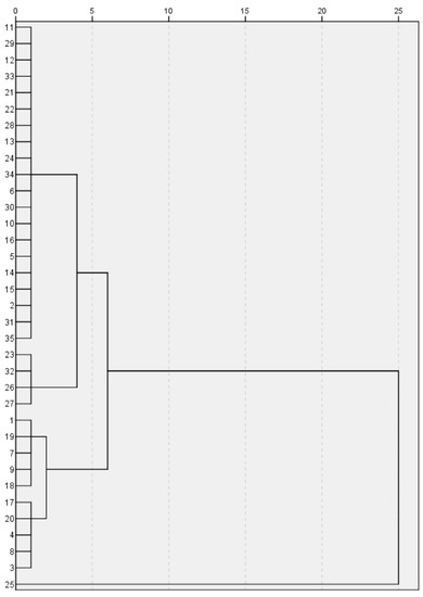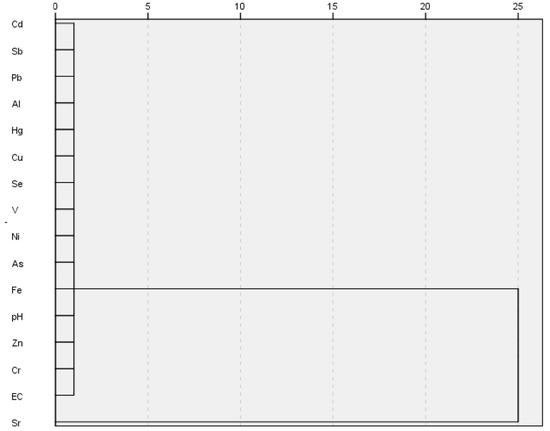 HMs are transformed in seawater under the effect of water dynamics and are not persistent. Consequently, the sources of HMs in seawater bodies appear to be more complex [10,45,46]. Q-mode HCA clustered the 35 studied localities into 2 clusters that had distinctive HM characteristics (Figure 5). The first cluster, which includes only Sample 25, contained the highest concentrations of Cd, Fe, Zn, Ni, Sr, and EC. The remaining 34 samples constitute the second cluster, which was further subdivided into two clusters (Figure 6). The first cluster group comprised pH, EC, Al, As, Cd, Cr, Cu, Fe, Hg, Pb, Sb, Se, V, Zn, and Ni, whereas the second cluster group only contains Sr. The sources of HMs were determined with Pearson’s correlation [47], which suggested the low positive correlations of Sr–EC, Sr–As, Sr–Ni, and Sr–Zn; V–Fe and V–Sb. (Table 4). The presence of V was correlated with Fe and Sb, implying that these metals might have originated from combined geogenic and anthropogenic sources, and are associated with oxides and hydroxides of Fe during rock weathering [48,49]. Moreover, the positive correlations of Cu–Cr, Cr–Se, Ni–Pb, Ni–Zn, and Zn–As suggest anthropogenic sources from industrial and agricultural effluents apart from their natural sources [50,51]. The absence of strong positive correlations among many heavy-metal elemental pairs indicate that these HMs are derived from different contamination sources [52].
