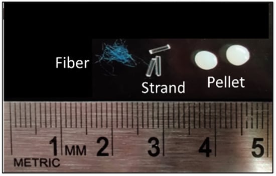 We studied three common shapes (types) of MP with the same size range of 3 mm: fibers (polyacrylic), strands (polymethyl methacrylate), and pellets (acrylonitrile butadiene styrene) (Figure 1). Fibers were fabricated manually by cutting 100% acrylic “Caron H970039767 Simply Soft” yarn to an average length of 3 mm. Strands were obtained by cutting the commercially available “AKEPO 16W Twinkle Fiber Optic Lights” (0.75 mm diameter) to an average length of 3 mm. Manufactured plastic pellets with an average diameter of 3 mm were purchased from the Victory Pellet company.