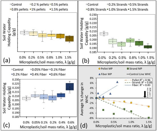 (a–c) depict the observed WHC as a function of λ (g/g) with standard Box and Whisker plots of WHC for samples contaminated by pellets, strands, and fibers, respectively. Each boxplot displays the median (middle line), mean (cross), first and third quartiles (lower and upper box lid), and collected data with dots. (d) shows through-the-origin linear regressions of the average values (N = 10 samples).