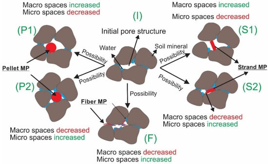 An illustration of a few scenarios of how pellet, strand, and fiber MP can alter the pore structure of sandy soil. A clean soil’s initial pore structure is shown in (I). As shown in Figures (P1 and 2) and (S1 and 2), soil micropore and macro pore structure can increase or decrease depending upon different soil mineral arrangements, while polluted by pellet and strand MP, respectively. F illustrates how fiber can become tangled and increase the total number of micro spaces inside the pore structure.