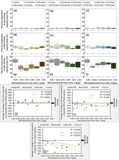 (a–i) depict the time required to evaporate 15%, 50%, and 75% of field capacity as a function of λ (g/g), for samples contaminated by pellets, strands, and fibers, respectively. Each boxplot displays the median (middle line), mean (cross), first and third quartiles (lower and upper box lid), and collected data with dots. (j–l) show through-the-origin linear regressions of the average values (N = 10 samples).