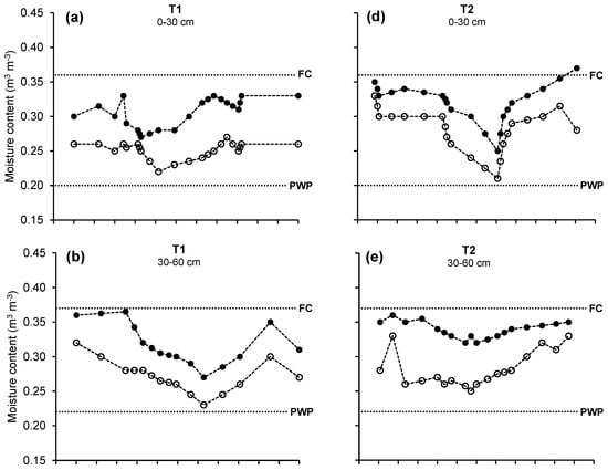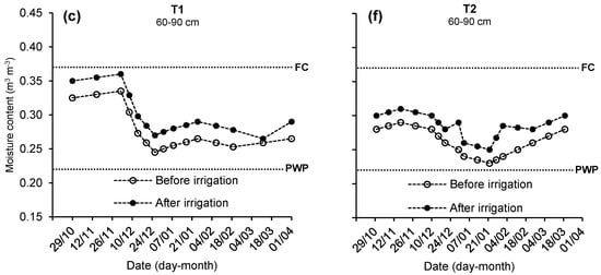 Cycles of soil moisture content before and one day after irrigation in the (a,d) 0–30 cm, (b,e) 30–60 cm, and (c,f) 60–90 cm strata throughout the 2009–2010 irrigation season for two microjet irrigation treatments of ‘Royal Gala’ apple trees. T1: Irrigation with theoretical volume required by the plant. T2: Irrigation with farm protocol. Each point is the average of 12 readings. FC is field capacity and PWP is permanent wilting point.