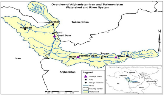 After the defeat of the Taliban Regime in 2001, the Afghan government has restructured its political presence in both regional and international arenas. Due to its unique geographical location, Afghanistan is a bridge between South and Central Asia [1]. According to Favre and Kamal [2], over ninety percent of the surface water flowing through Afghanistan is transboundary water. Four out of five major river basins in Afghanistan—the rivers Harirud, Helmand, Amu Darya, and Kabul—are shared watercourses; except for Kabul River Basin, in most cases, Afghanistan is the upstream riparian [3,4,5,6,7,8,9].
