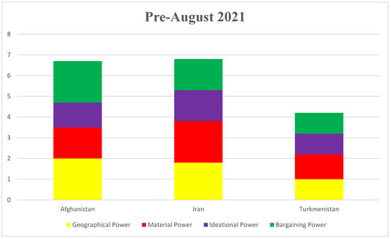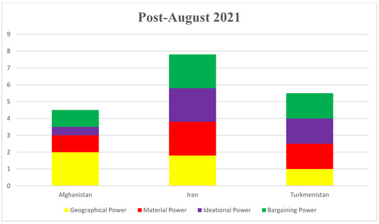 The stacked bar charts (Figure 2 and Figure 3) illustrate how the Ideational, bargaining, and geographical powers of the riparian states fluctuated especially after the establishment of Taliban regime in Afghanistan, given the rapid withdrawal of the US forces from Afghanistan alongside massive immigration of Afghan water professionals, academicians, and experts [70,75,76]. As explained in the method, we have scaled and scored each pillar of hydro-hegemony from 1 to 2 where 1 represents the lowest position and 2 represents the highest position in each pillar of hydro-hegemony. For instance, before the Taliban’s taking over, while Afghanistan had the potential of having the highest bargaining power in the basin after the completion of Pashdan dam and its inter-related canals, Iran, and Turkmenistan, as the downstream countries, had middle and lowest positions, respectively from bargaining power perspective. However, the bargaining power of these co-riparian nations rapidly changed with the swift withdrawal of US forces from Afghanistan and the re-establishment of Taliban’s regime in the upstream [13,76]. For instance, the permanent halt of Pashdan dam due to lack of financial and technical expertise under Taliban’s administration alongside the establishment of a fragile, weak, and unrecognized government under Taliban’s leadership led to the decline of Afghanistan’s bargaining power in the Harirud River Basin [46,47]. In contrast, the bargaining power of the downstream nations have increased with the rapid withdrawal of international forces from Afghanistan in August 2021.