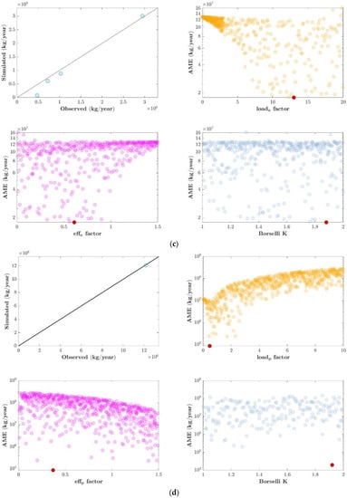 The Nutrient Delivery Ratio model parameters are presented in Table 10. For this model, the LCS_p and LCS_n parameters were set to a value of 200 m, while the EMR_p and EMR_n parameters were set to a value of 0, all in accordance with the recommendations of the user’s guide of the model []. The retention distances for both phosphorus and nitrogen (crit_len_p, crit_len_n) were set to a value of 200 m, a value which is less than the pixel resolution and is consistent with the recommendation in the user guide []. Finally, the ratio_surface_n parameter was set to a value of 0, in order not to consider subsurface aspects in the modeling.