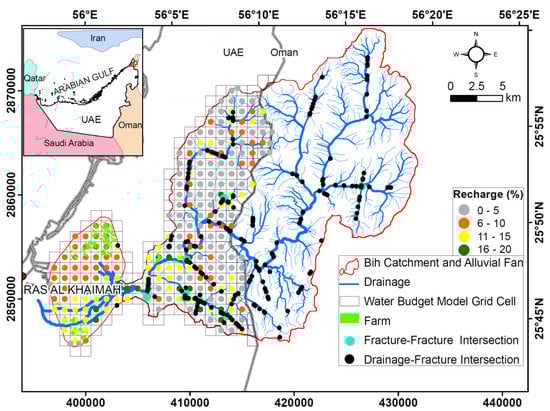 Location map of the Wadi Al Bih area showing the catchment, drainage pattern, fracture–fracture and fracture–drainage intersections, dams, farms, water budget model grid, and recharge percentage from rain for each grid cell.