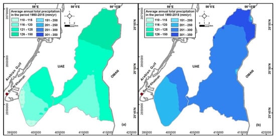 The average total annual precipitation in the period 1980–2015 ranged from 110–150 mm (Figure 2a). While in an average wet year, such as the water year 2019–2020, it ranged from 140–350 mm/year (Figure 2b). In that year and in almost the whole area, the total annual precipitation was 2–3-fold its average value. The amount of rain that can fall in a single storm may exceed the total rainfall of a dry year (e.g., 35.80 mm in 1984). The Abu Dhabi Global Environmental Data Initiative (AGEDI) (2015) also documented that under climate change, rain events will be more intense but with longer dry spells. This may be due to the influence of warming in the air [9]. Warm air holds more moisture and, as a result, more evaporation and vapor condensation. Thus, when a rain event occurs, it will be more extreme due to added moisture [10].