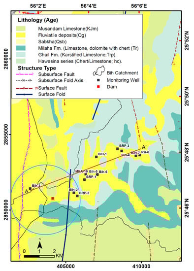 Geological map of Wadi Al Bih (modified from [11]). Kjm: Cretaceous–Jurassic; Qg: Quaternary gravels; Qsb: Quaternary sabkha; Tr: Triassic. Locations of the monitoring wells and the main dam are also shown.