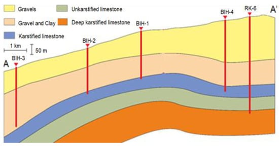 Subsurface hydrogeological cross-section along direction A–A’. The cross-section location is shown in Figure 3.