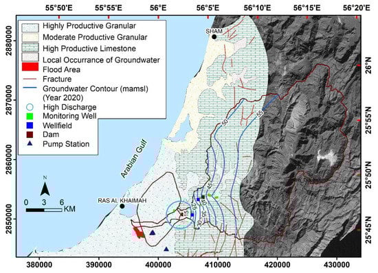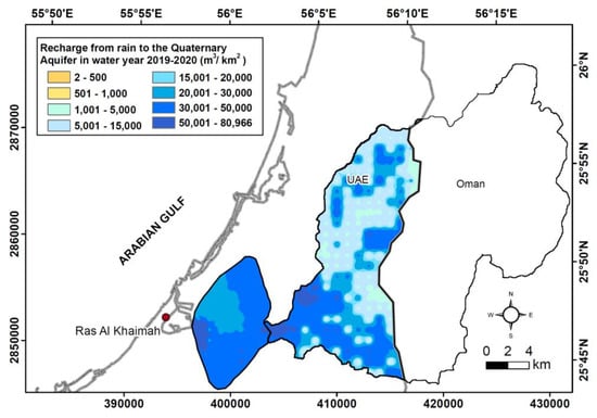 According to the UAE water conservation policy and UAE water strategy (2017), the limited groundwater abstraction for domestic use (currently 6 MCM/yr) will be ceased starting in 2026. Additionally, it is observed that there has been a remarkable increase in precipitation starting from the year 2017. For example, the total annual average precipitation in the water year 2019–2020 in Wadi Al Bih is more than two folds of its historical average (120 mm/yr.). The recharge to the Quaternary aquifer in that year was estimated using the potential method and the GWBM model developed by Sherif et al. 2018 (Figure 11) [26]. The total estimated recharge from the rain was estimated at a value of 8.8 MCM, and this is almost double the current groundwater abstraction for domestic use in Wadi Al Bih. Freshwater resources in this area have been playing an important role in the water security of Ras Al Khaimah emirate and will continue to if properly managed. Ensuring water security is one of the United Nations’ seventeen sustainable development goals (SDGs). Water security is rooted not only in the physical availability of freshwater resources relative to water demand but also in social and economic factors [38].
