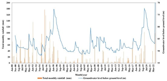 The primary data were collected from several authorities, organizations, and previous studies [11,12,14,15]. The geological maps of the Northern Emirates, 8 lithological logs of wells with a maximum total drilled depth of 200 m below the ground surface, available subsurface geological sections, and several newly constructed subsurface geological cross-sections were validated before storage in a GIS database to facilitate spatial and temporal analysis using the groundwater budget model as input. In addition, several hydrogeological and geophysical investigations were conducted in the Wadi Al Bih area [11,12,14]. These studies have documented detailed data on geoelectrical cross-sections, geophysical and lithological logs, sub-surface geological cross-sections, types of the aquifer and their geometric settings, water-table elevation records, and pumping tests. Ten monitoring wells are available with all the lithological logs and drilling details. These wells cover the majority of the Wadi Al Bih area (green squares in Figure 5), and all of them have been constantly used to examine water table elevations (an example is shown in Figure 6) and groundwater quality since 1988. Climate change affects the groundwater system in many ways [16]. In hydrological cycle terminology, climate change affects soil infiltration, percolation, deep percolation, and, thus, groundwater storage. The increase in evaporation due to higher temperatures also limits recharge. Thus, to assess the effect of these major variables, such as rainfall, temperature, and potential evaporation (due to the non-availability of in situ evaporation data), we obtained the potential evaporation data from [17] and the rainfall and temperature data from the National Climate Meteorology (NCM), UAE rain gauge network. NCM gauges measure rainfall electronically with a threshold of 0.2 mm. The groundwater recharge estimation was performed based on a water budget model approach.