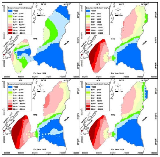 The UAE part of Wadi Al Bih was divided into a grid of equal squares with an area of 1 km2 (Figure 1). The Kriging technique with the appropriate variogram models was used to assign the values of aquifer base elevation, water table elevation, and saturated thickness (in 1969, 2005, 2010, and 2015), safe yield (sy), and groundwater salinity for 1969, 2005, 2015, and 2020 (Figure 7) for each of the 229 grid cells (Figure 1). Sy for the Quaternary aquifer in the study area was calculated from the pumping test experiments for nine wells. An exact/approximate interpolator was implemented by the gridding techniques based on the goals of the study. A suitable variogram model was selected to fit the Kriging method to the observed data (Figure 1). This step was done to avoid the under or over-estimation of the parameters at any cell by utilizing suitable control points (e.g., constant salinity points in the Arabian Gulf). The variogram testing and stochastic modeling process were repetitively used with each parameter to prevent the requirement for sensitivity analysis.