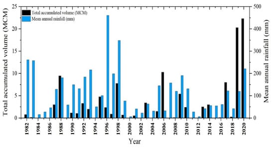 Accumulated water volumes behind Wadi Al Bih Dam in the period 1982–2020 (Source MoEI).