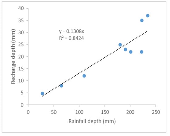 Correlation between the estimated recharge depth and rainfall depth in Wadi Al Bih.