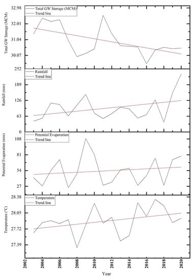 The effect of climate variables (rainfall, temperature, and potential evaporation) on estimated groundwater storage using groundwater levels was identified by applying the Mann–Kendall trend test from 2003 to 2020. The trend of each variable for groundwater recharge is presented in Figure 10. The results showed a significant increase in temperature and rainfall (Z values 1.85 and 1.97) and a nonsignificant positive in evaporation (Z value 0.98) over the study area. The total groundwater storage showed a Z value (−2.12), which was statistically significant at the 0.05 level (two-sided). From 2016 to 2017, rainfall showed an upward trend, and total groundwater storage also slightly increased, while evaporation and temperature were on the upward side, which agrees with the water budget calculations (Table 1). This indicated that precipitation patterns directly influenced the total groundwater storage, and climate change might have a positive impact on the water resources of this area.