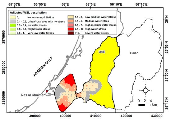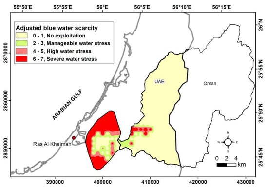With the water budget net with a one-kilometer interval, the stress was calculated differently depending on the land use. For example, in agricultural areas (the most water-stressed areas in UAE), the denominator of Equation (12) was changed three times. The available water resources were set to equal to the renewable conventional water resources only, renewable conventional water resources plus the available fossil groundwater resources with TDS up to 5000 mg/l, and finally, renewable conventional water resources plus the available fossil groundwater resources with TDS up to 10,000 mg/l to assess groundwater depletion [39].