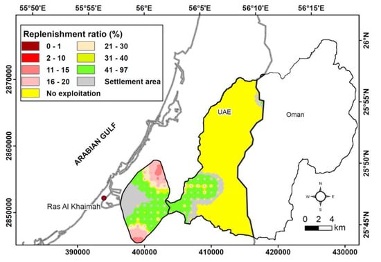 where DTneti is the net total water demand from all the sectors (it is the sum of livestock, irrigation, industrial, and domestic water demand), DSW is the desalinated water use, NRGW is the fossil groundwater abstraction, and SFWA is the surface freshwater availability. Since there is no perennial surface water in UAE and, thus, in Wadi Al Bih, the term SFWAi in the denominator was replaced by the total recharge from all sources.